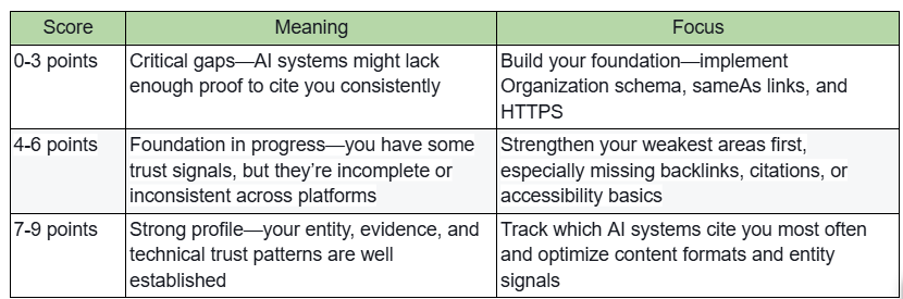 Add a bullet for every statement that applies—each one is worth one point. Your total score gives you a fast, directional read on how trustworthy your brand appears to AI systems.